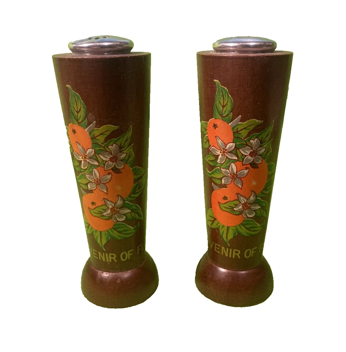These Cute Vintage Wood Salt & Pepper shakers features Florida Oranges. Made in Japan. These ceramic Salt & Pepper Shakers measure 4 3/4 inches tall x 1 3/8 inches in diameter.